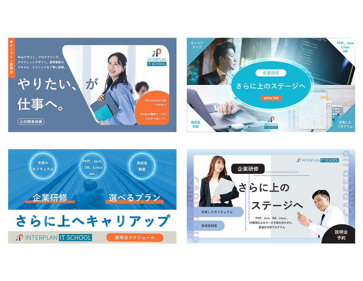 Web広告バナー Banner 制作概要 インタープランITスクールの Webサイトを参考に、様々なパターンで Web広告バナーを作成しました。 使用ツール Photoshop 制作期間 1バナーあたり:1~2日 学び得たこと オリジナルのデザインを考える中で、基礎的な構成などをしっかりと学びながら作る意識を持つことができた。 定期的に作成して自分の中の引き出しを増やしていきたい。 Back Works一覧へ Next
